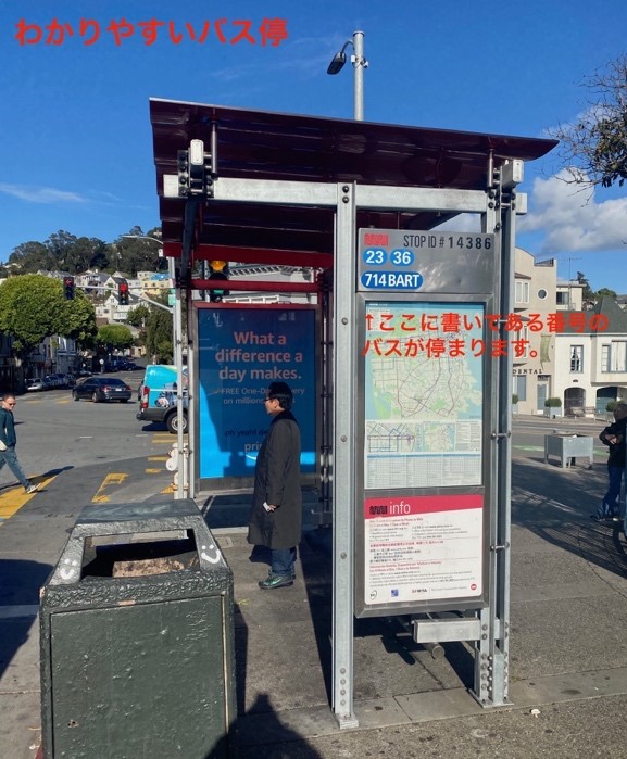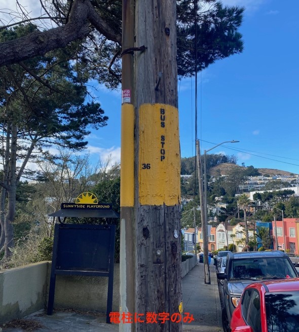 MUNIのバス停はわかりやすく屋根や椅子があるバス停もあれば、全く特別なところが見当たらない、電柱や道路に数字だけ記載されていることもあるので見逃さないように注意しましょう。