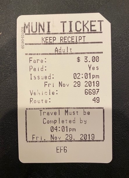MUNIは電車でもバスでも、一度乗ったらMUNI内であれば2時間以内は同じチケット、もしくはクリッパーカードにて無料で乗車することができます。(乗車時にチケットを見せるかクリッパーカードをタップする)