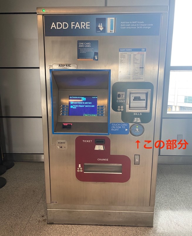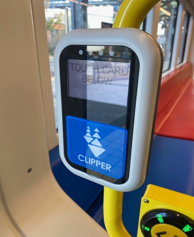 MUNIバス、MUNIトレインはバス、電車内(もしくは電車改札)にある”CLIPPER”と書かれた小さな機械にクリッパーカードをかざせば自動で料金が残高から引かれて乗車することができます。