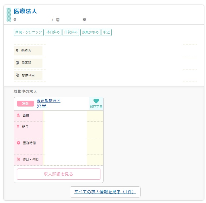 絞り込んだあと求人検索結果画面を確認すると、病院の基本情報が先にきて、その下に募集中の求人が出てきます。検索結果一覧には資格、給与、勤務時間、休日・休暇が掲載されており、
