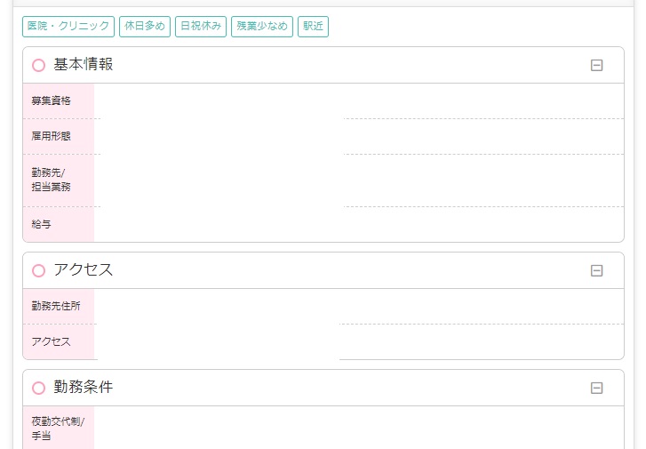 求人詳細画面を見ると基本情報、アクセス、勤務条件、待遇・補足がこと細かに記されています。