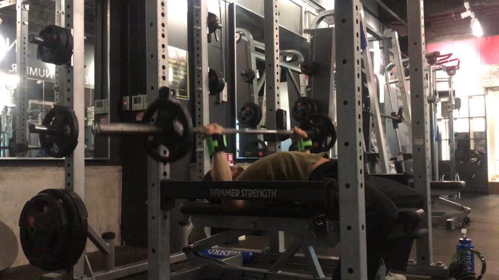 「ベンチに寝てバーベルを持ち上げる」