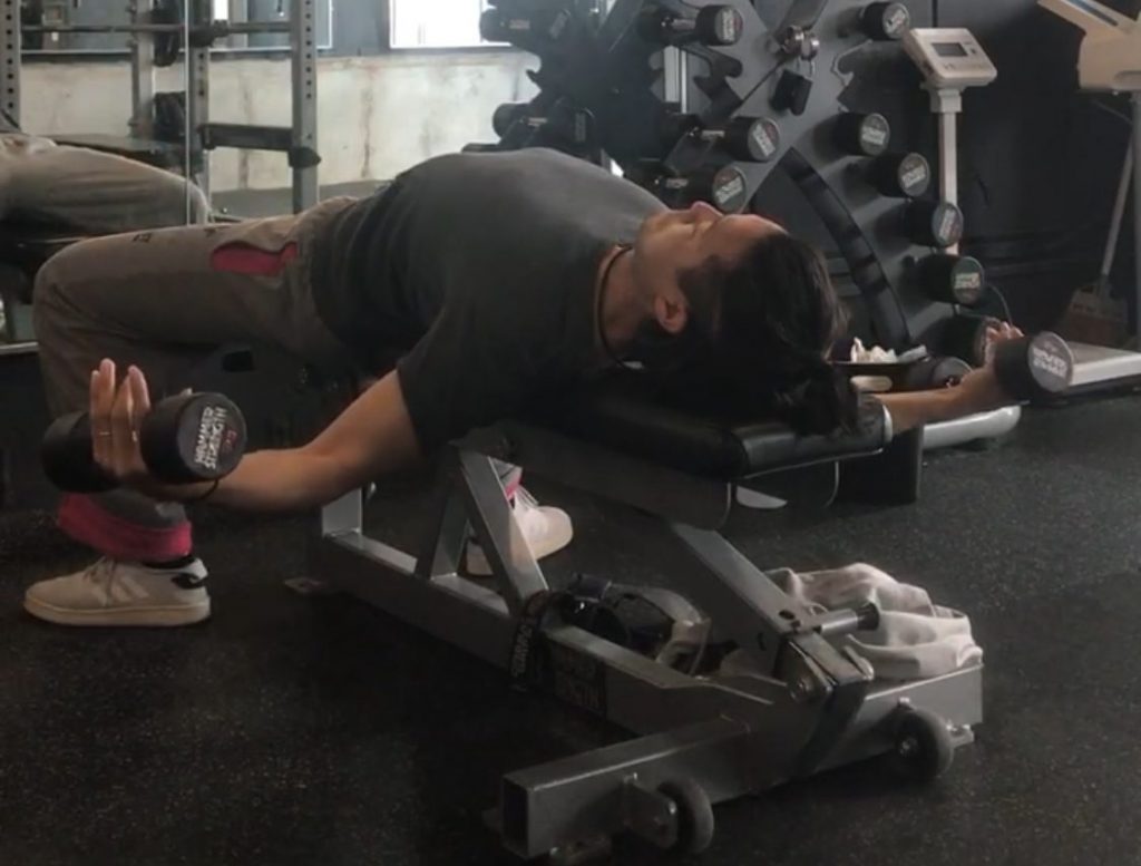 しかし、いざダンベルフライになった途端、胸が張れず肩を突き出すような姿勢でダンベルを上下してしまうという問題は起きがちです。