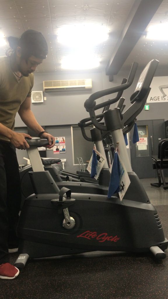 ストレッチをかける感覚を掴むために、まずは前傾姿勢用の前方の持ち手を掴んで漕いでみましょう。