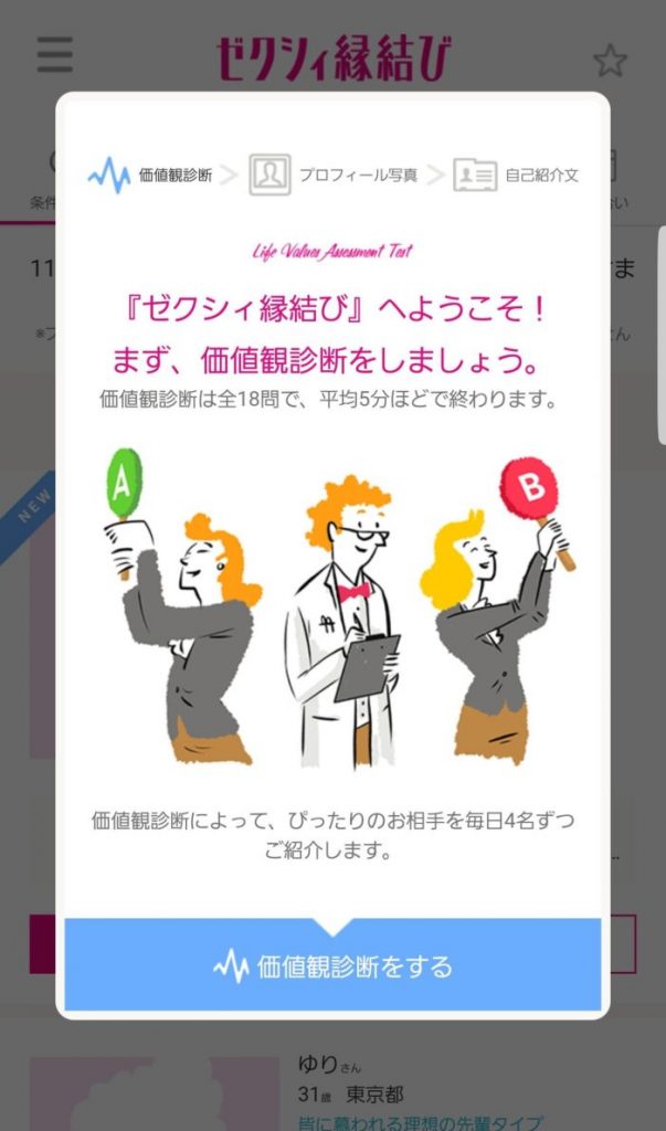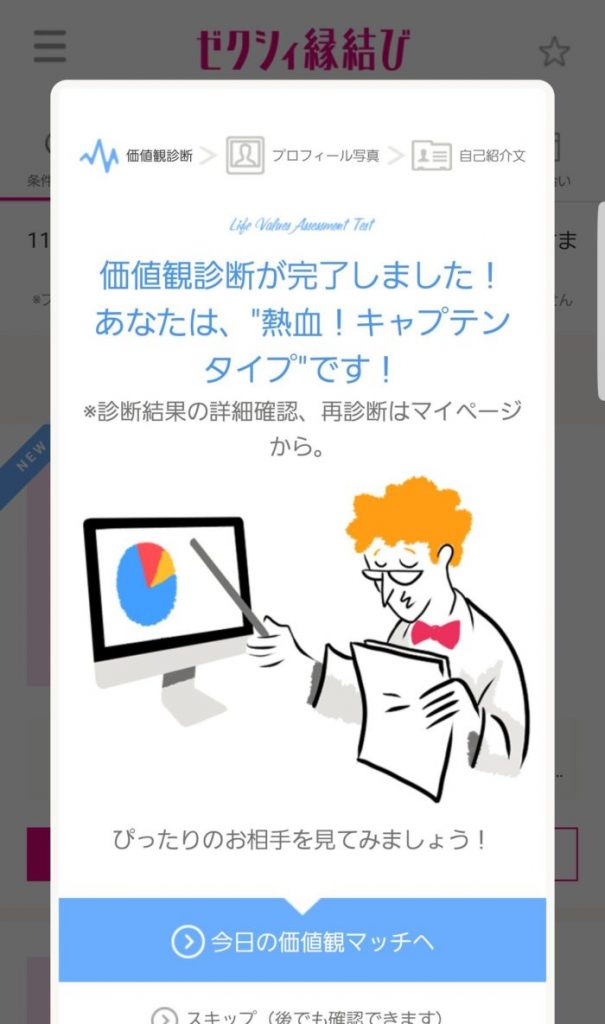 私の場合は、熱血キャプテンという結果でしたが、自分がどのようなタイプなのかを導きだしてくれて、これが毎日使うことになる価値観マッチにも影響してくるのでできるだけ偽りなく診断は進めるようにしてくださいね!