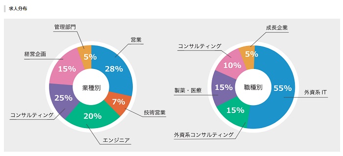121転職は上記、分布をみていただければわかるように、業種は営業、コンサルティング、エンジニア、経営企画に強く、職種は外資系が多く、外資系に圧倒的に強いことがわかります。