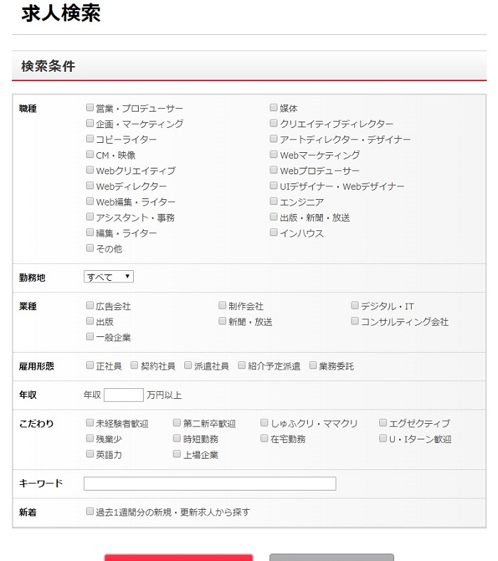 職種は、営業・プロデューサー、媒体、企画・マーケティング、クリエイティブディレクター、コピーライター、アートディレクター・デザイナー、 CM・映像などから選べるようになっています。