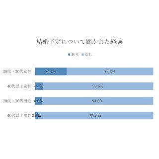 “転職時の面接で、「結婚の予定について質問された経験がある」人の割合は、全体では10%に留まったものの、20代・30代女性では26.7%にのぼった。”
